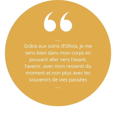 Grâce aux soins d'Olivia, je me sens bien dans mon corps en pouvant aller vers l'avant, l'avenir, avec mon ressenti du moment et non plus avec les souvenirs (inconscients) de vies passées."